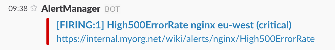 text: 'https://internal.myorg.net/wiki/alerts/{{ .GroupLabels.app }}/{{ .GroupLabels.alertname }}'